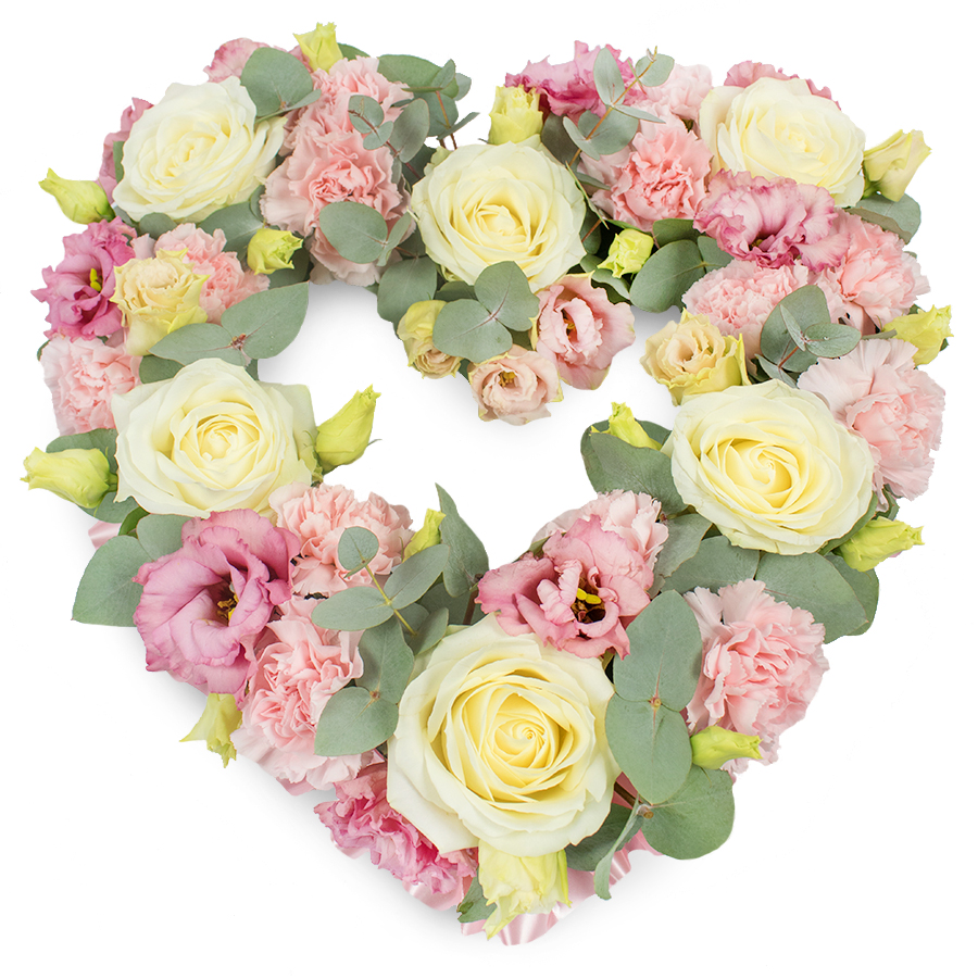 Express your love and remembrance with our Memorial Open Heart Bouquet. This unique arrangement combines elegant white roses, soft pink carnations, pink lisianthus, and eucalyptus leaves, creating a beautiful tribute to your dearly departed.